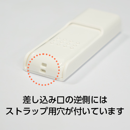 紛失防止にストラップを付ける際は、差し込み口逆側に穴が空いていますのでそちらをご利用ください。